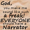 [image description - crumpled paper background with the text: God, you make me sound like such a freak! Everyone should have a narrator]