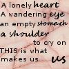 [image description: icon with pink marble background and the text: A lonely heart a wandering eye an empty stomach a shoulder to cry on This is what makes us us]